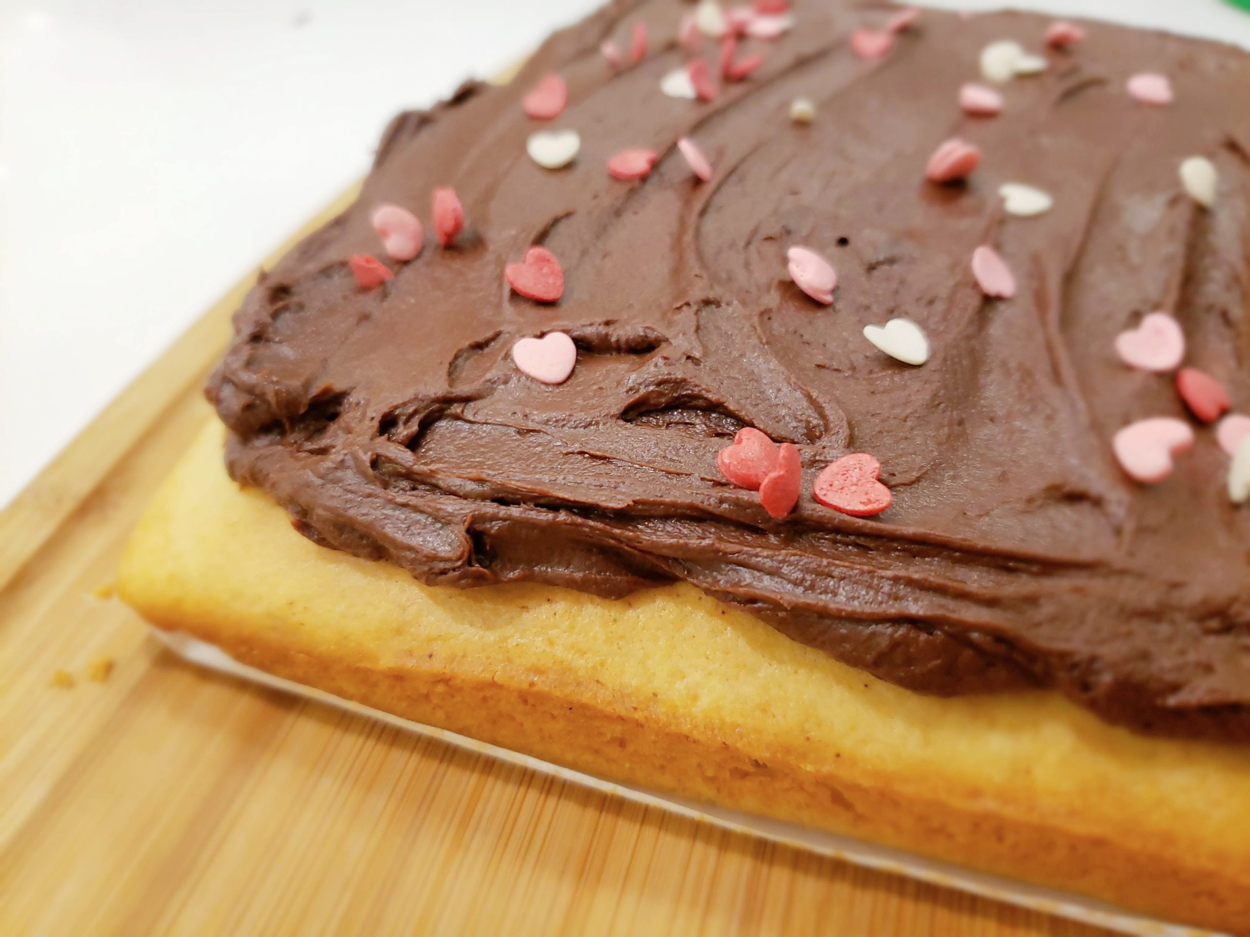 12. Tienen que esperar a que la torta esté templada para colocar el frosting, pero esto no lleva más de 15 minutos, o por ahí. Simplemente lo esparcen por encima, lo que ya es un placer total, y colocan unos sprinkles o algo lindo.