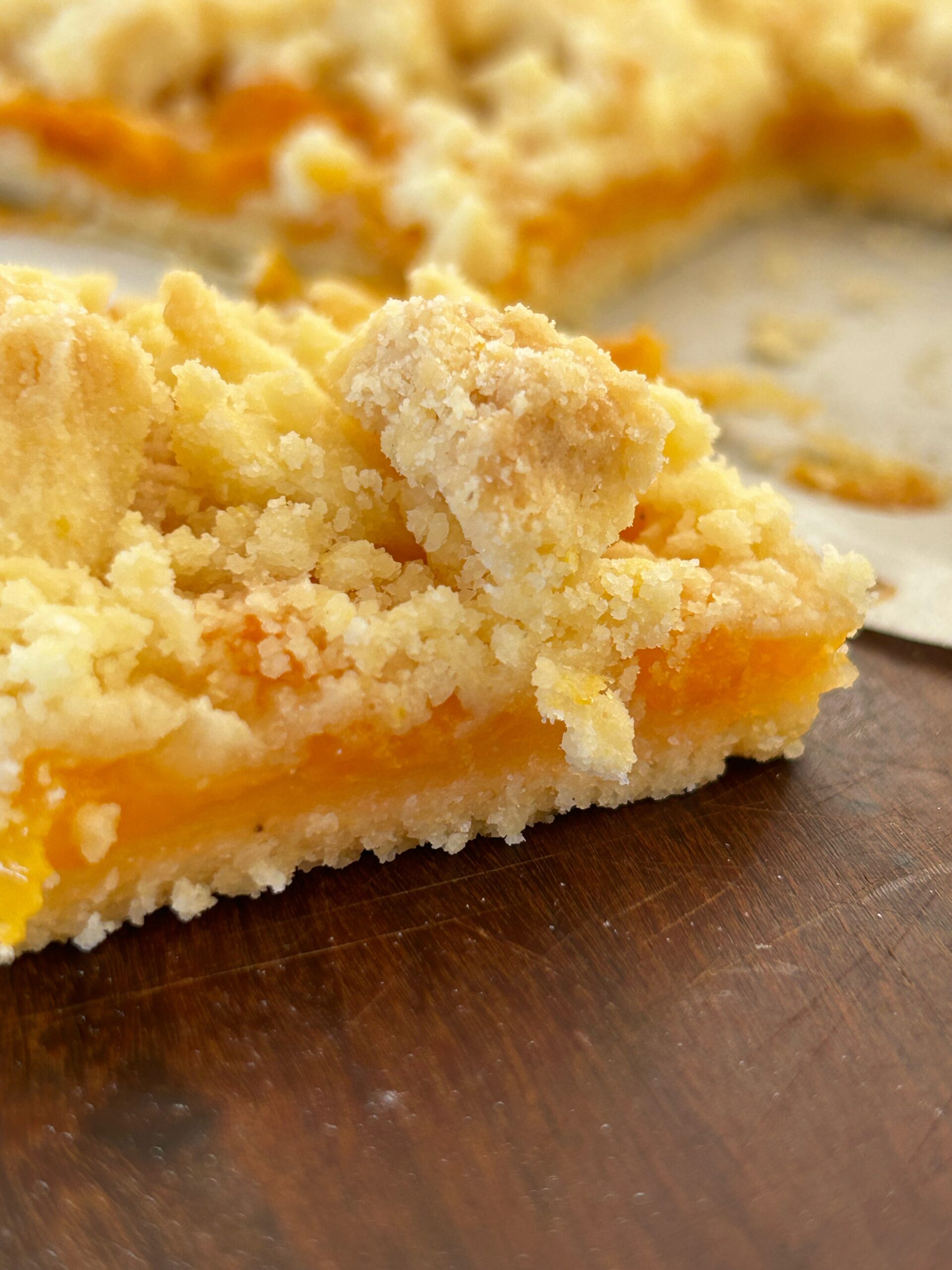 Cuadraditos de duraznos con crumble. Sin gluten y muy espectaculares.