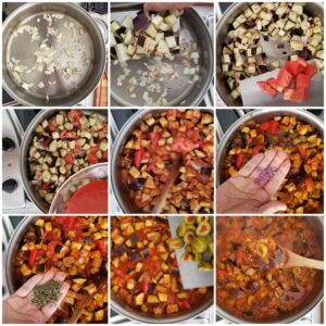 4. Cortar las berenjenas con cáscara en cubos de 1,5 cm de lado y agregar al salteado. Cocinar removiendo por unos 5 minutos.