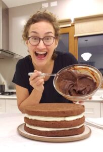 Las cantidades que les indico abajo les van a alcanzar para cubrir con una capa generosa, capaz de arreglar defectos y de que se note al tomar una porción con el tenedor, una torta de entre 22 y 26 cm. Ahora, si también quieren rellenar con una capa de ganache, calculen 100g más de chocolate y de crema, y si quieren dos capas, saquen sus cuentas.
