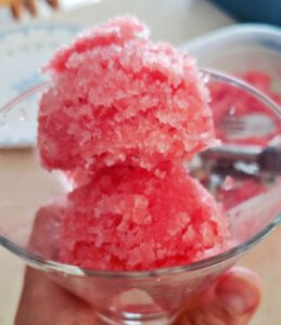 En fin, hoy con 42° y sentada en mi casa, me viene igual de bien. La granita de sandía es aromática, refrescante y muy atractiva. Es un postre y una bebida refrescante a la vez. Una maravilla de la cocina que pueden hacer con muchas otras frutas o jugos de frutas y tener disponible durante todo el verano.
