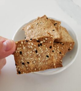 3. Cuando la necesiten, la dividen en dos si van a hacer una tarta, o la estiran toda si van a hacer crackers. Espolvorean las semillas por encima y le pasan el palo de amasar para que queden hundidas.