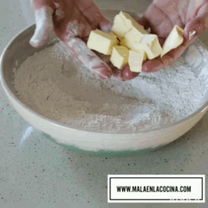 2. Agregar la manteca fría cortada en cubos y formar esas hojuelas de las que lee hablé antes.