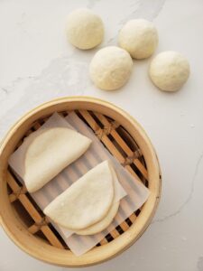 Estos pancitos,que en la versión original venían rellenos de cerdo, los aprendí hace unos años y los hago sólo cuando tengo algo muy bueno para rellenarlos. Nunca los hice sin saber qué iría dentro. Ya sé: me chifla el moño. es que su textura tan gomosita y suave requiere de un acompañante con personalidad, algo crocante, algo picante o ácido y una situación en la que se los pueda disfrutar. Ustedes háganlos cuando quieran.