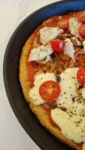 Harina: la cantidad de harina que usé tiene el único fin de absorber el exceso de agua que pueda tener el coliflor. Si quieren agregar más cuerpo a la prepizza, pueden incorporar unas cucharadas extra. La semita de maíz es ideal porque suma sabor y hace una miga ligera, pero pueden usar harina de trigo con confianza.