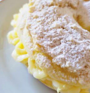 3. Distribuyen a lo largo de la masa una buena cantidad de crema pastelera y pliegan la masa a lo largo. Presionan con cuidado y cierran el chorizo de masa relleno. Forman la rosca sobre una placa con spray vegetal y unen los extremos. Fíjense que quede prolijo y bello. Si quieren que el centro quede extra redondo, coloquen un moldecito rociado con spray vegetal. Cubran con paño de cocina y dejen leudar en la mesada hasta que esté turgente y del doble de su tamaño.