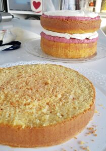 Esta torta tiene una masa de jengibre y cúrcuma que resulta en una miga perfumada y colorida, muy sedosa y un mini toque de pimienta que lo completa. Para darle más profundidad al sabor y más idea de postre me gusta humedecerla con un almíbar que haga juego con el relleno, pero si prefieren la masa sola, está perfecto.