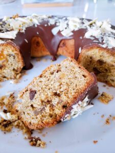 9. Para la cobertura, derretir el chocolate con el trocito de manteca y dejar templar. Distribuir por encima de la torta.