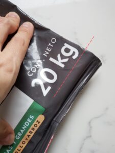 1. Primero van a cortar las "costuras" de la parte superior e inferior de la bolsa. En realidad está termosellado, pero ustedes entienden. Les debería quedar un tubo.